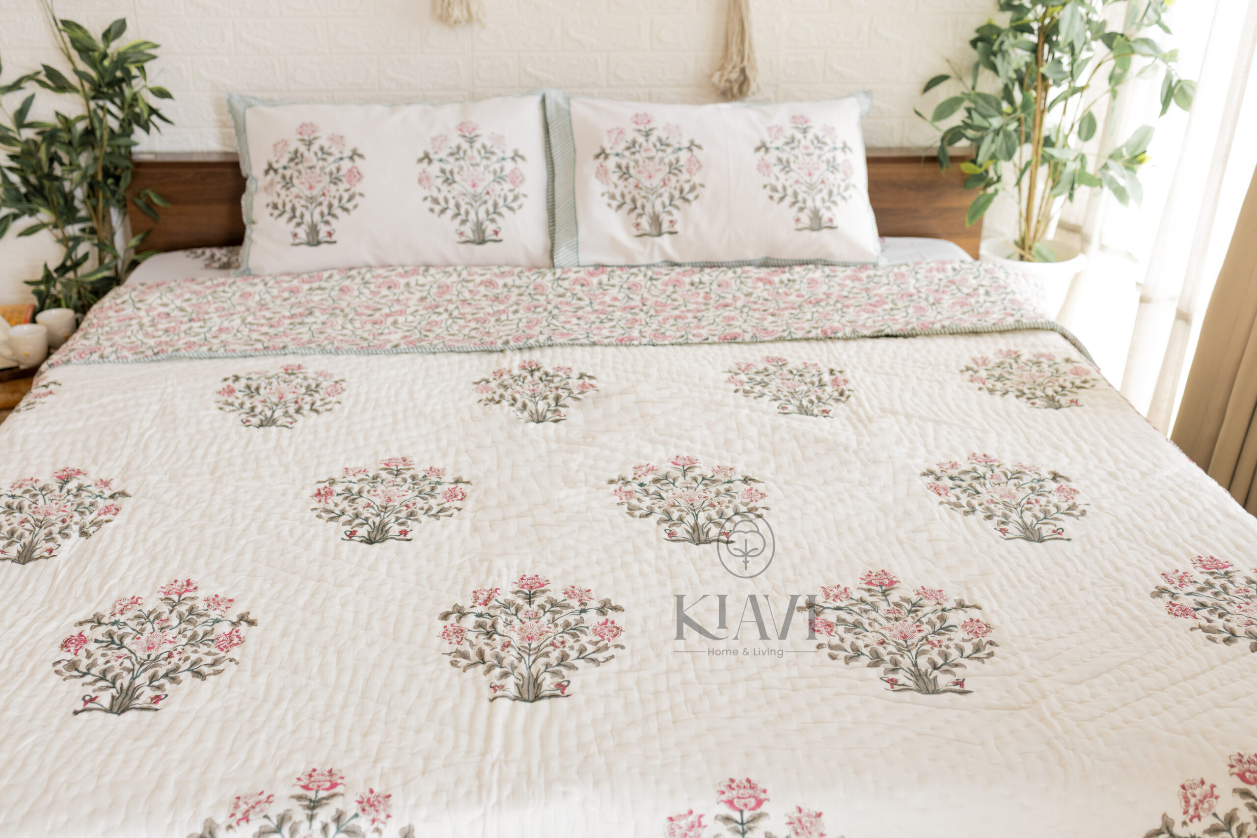 • Pillow Covers: 18*28 inches / 46*72 cms, matching the bedsheet with a hand-block printed floral design to enhance the overall look.