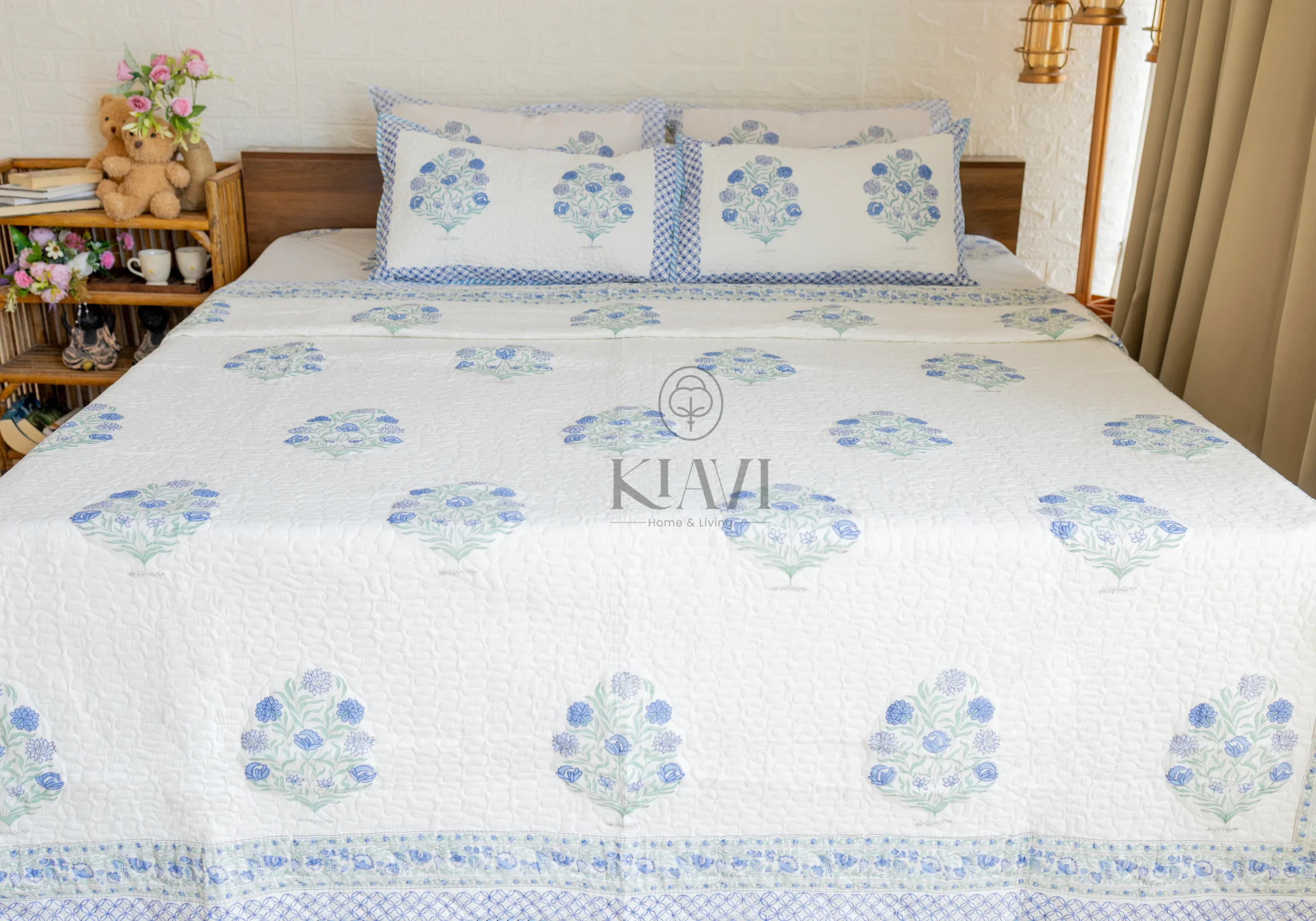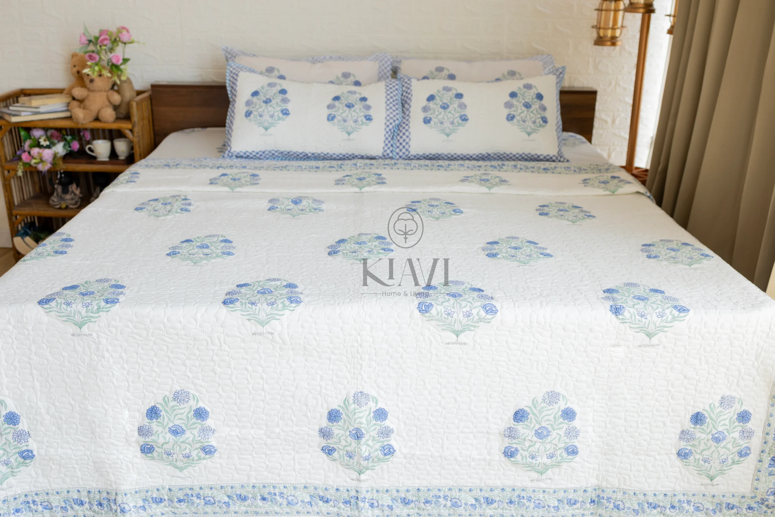 Frosted Blue Bedsheet Hand-Block Printed Bedding Set with BedCover