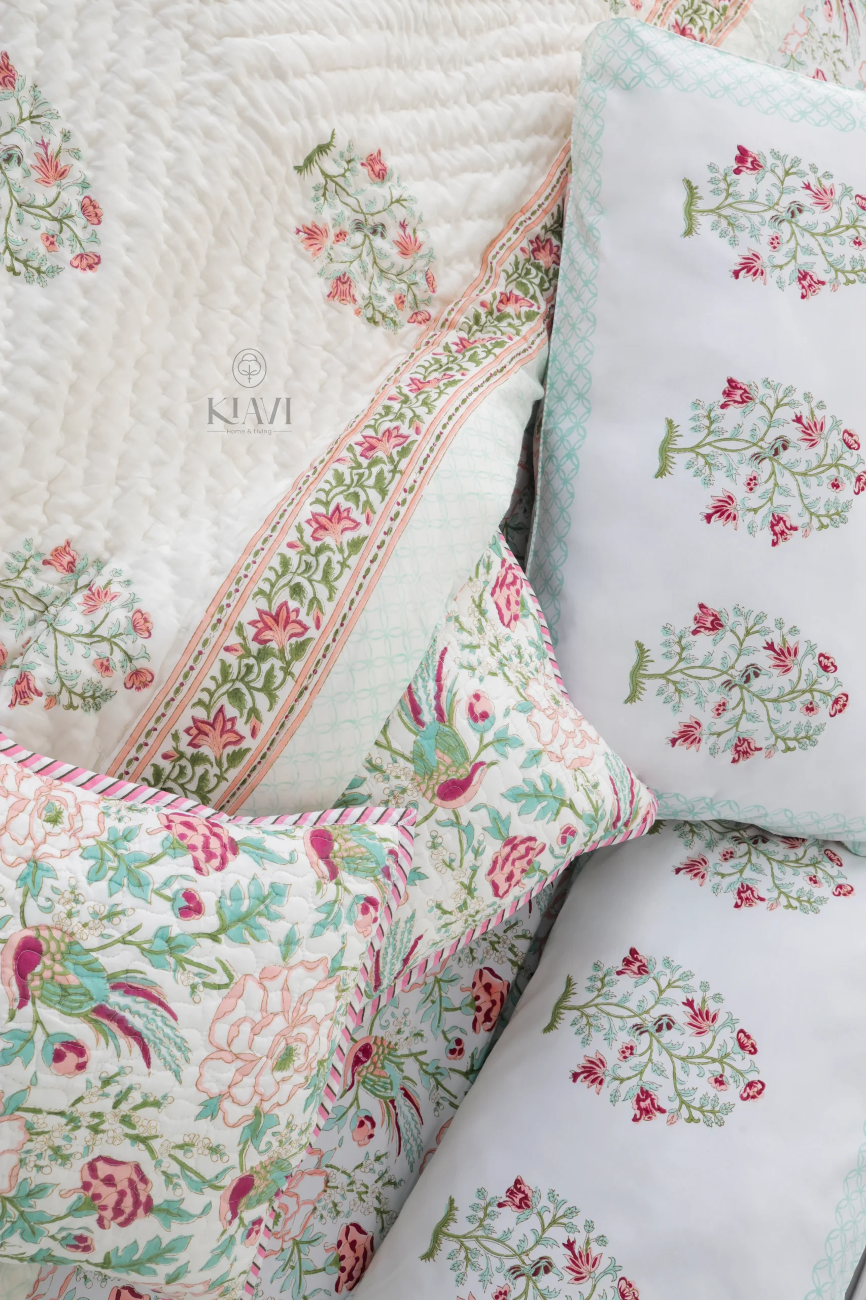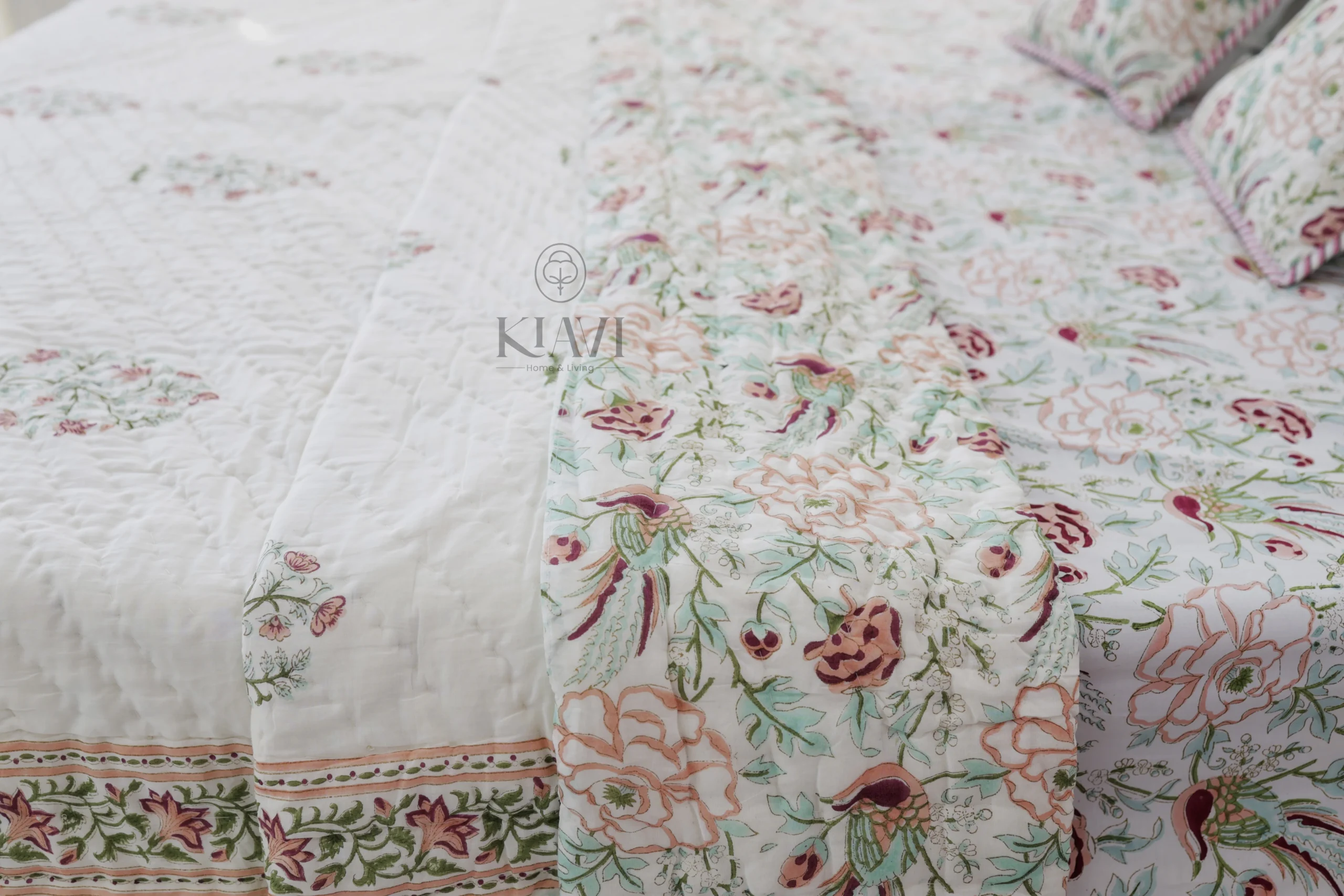 • Design: Elegant hand-block printed flowers, delicate birds, and greenery, paired with soft pastel colors, offering a balanced mix of nature and elegance.