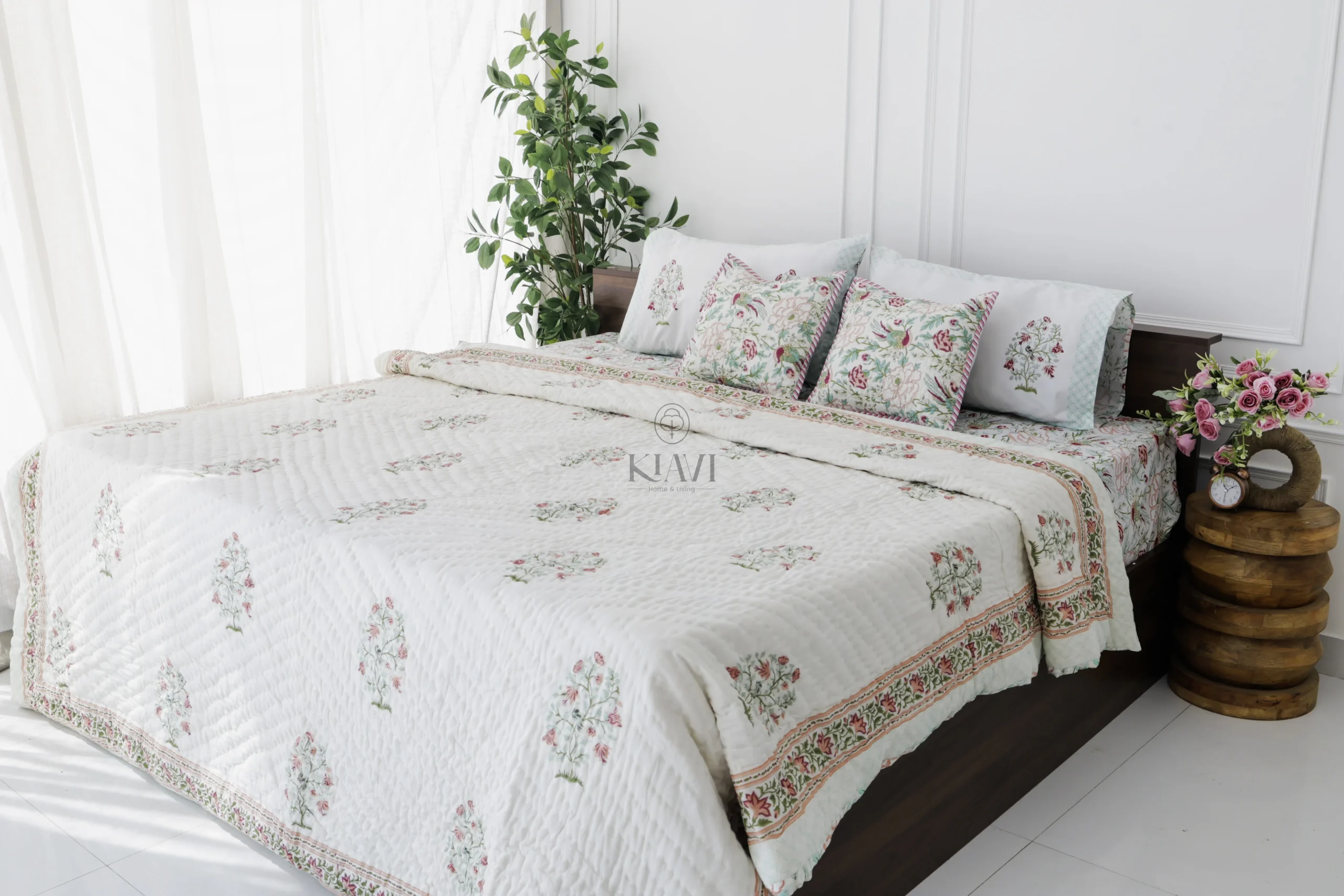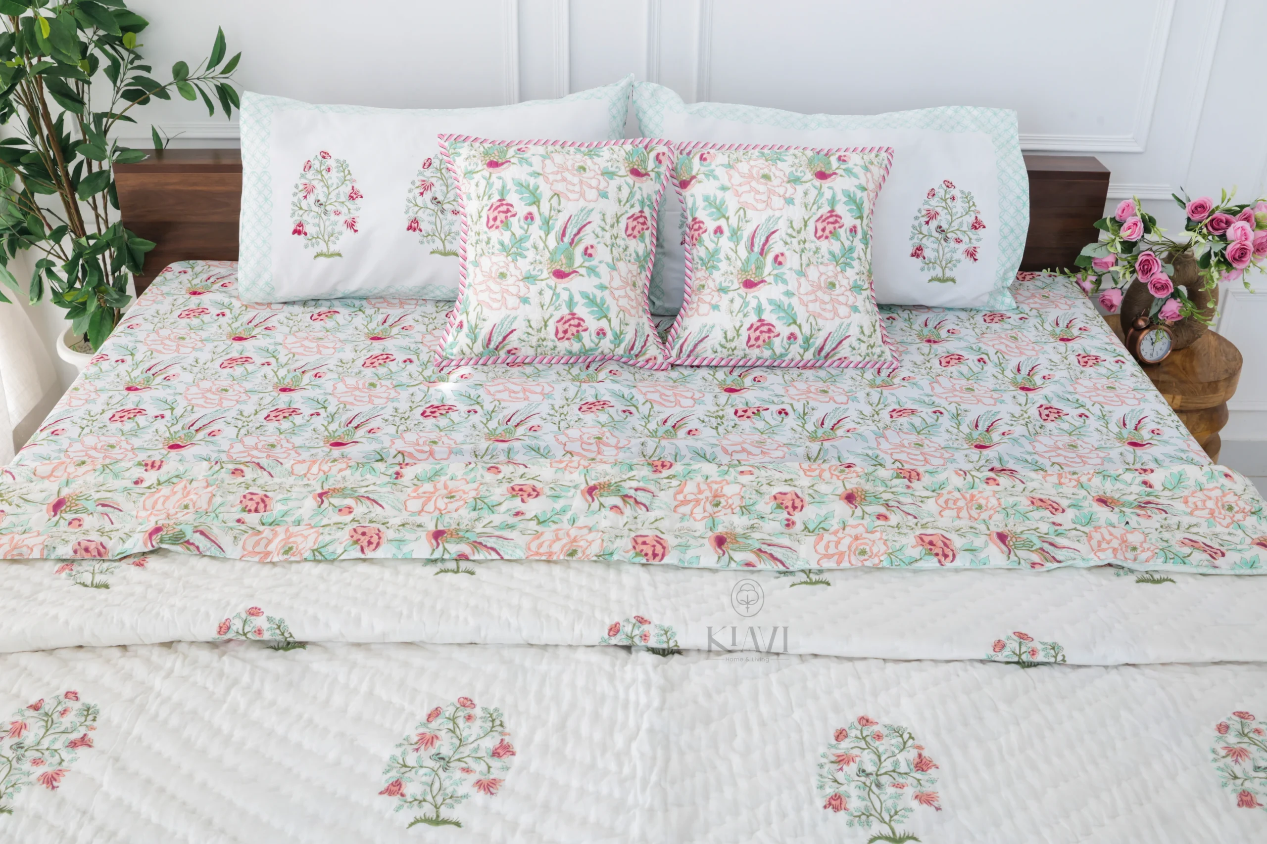 • Pillow Covers: 18*28 inches / 46*72 cms, matching the bedsheet with a hand-block printed floral design to enhance the overall look.
