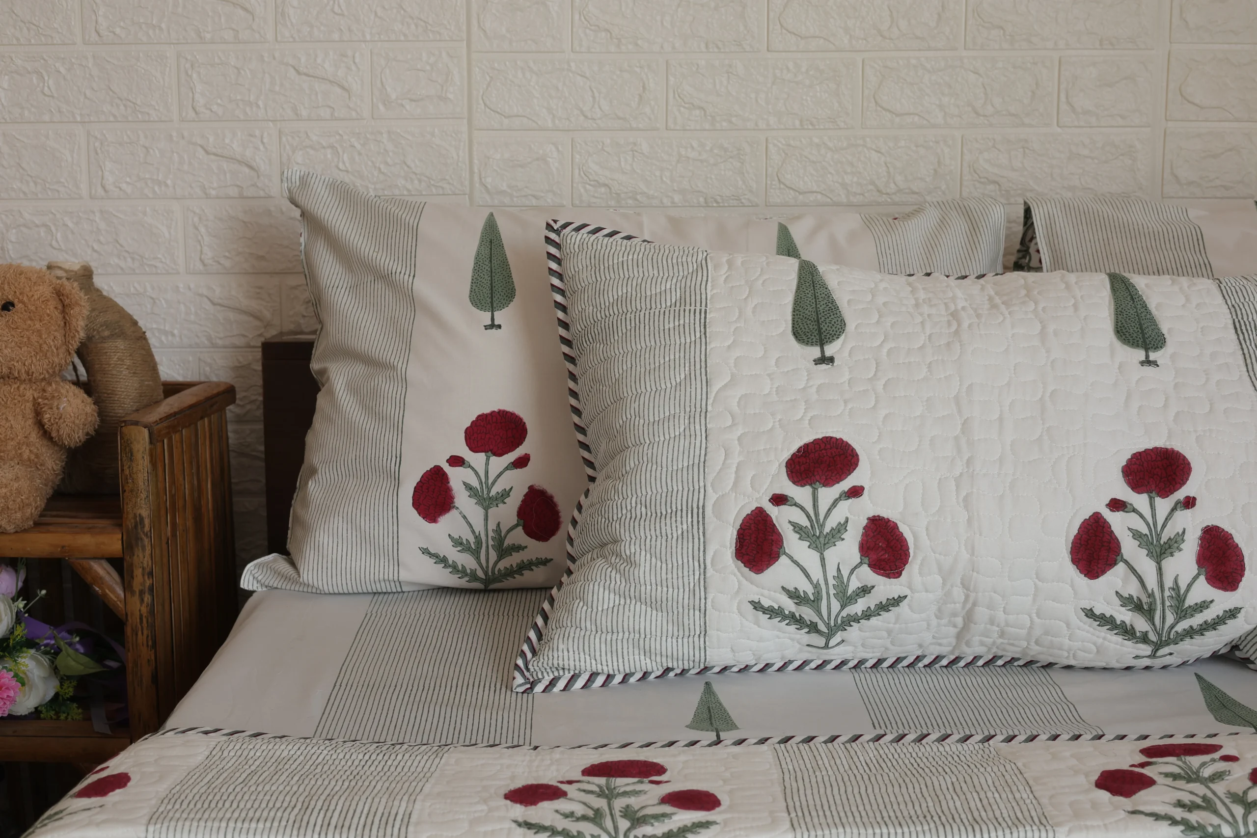 • Pillow Covers: 18*28 inches / 46*72 cms, matching the bedsheet with a hand-block printed floral design to enhance the overall look.