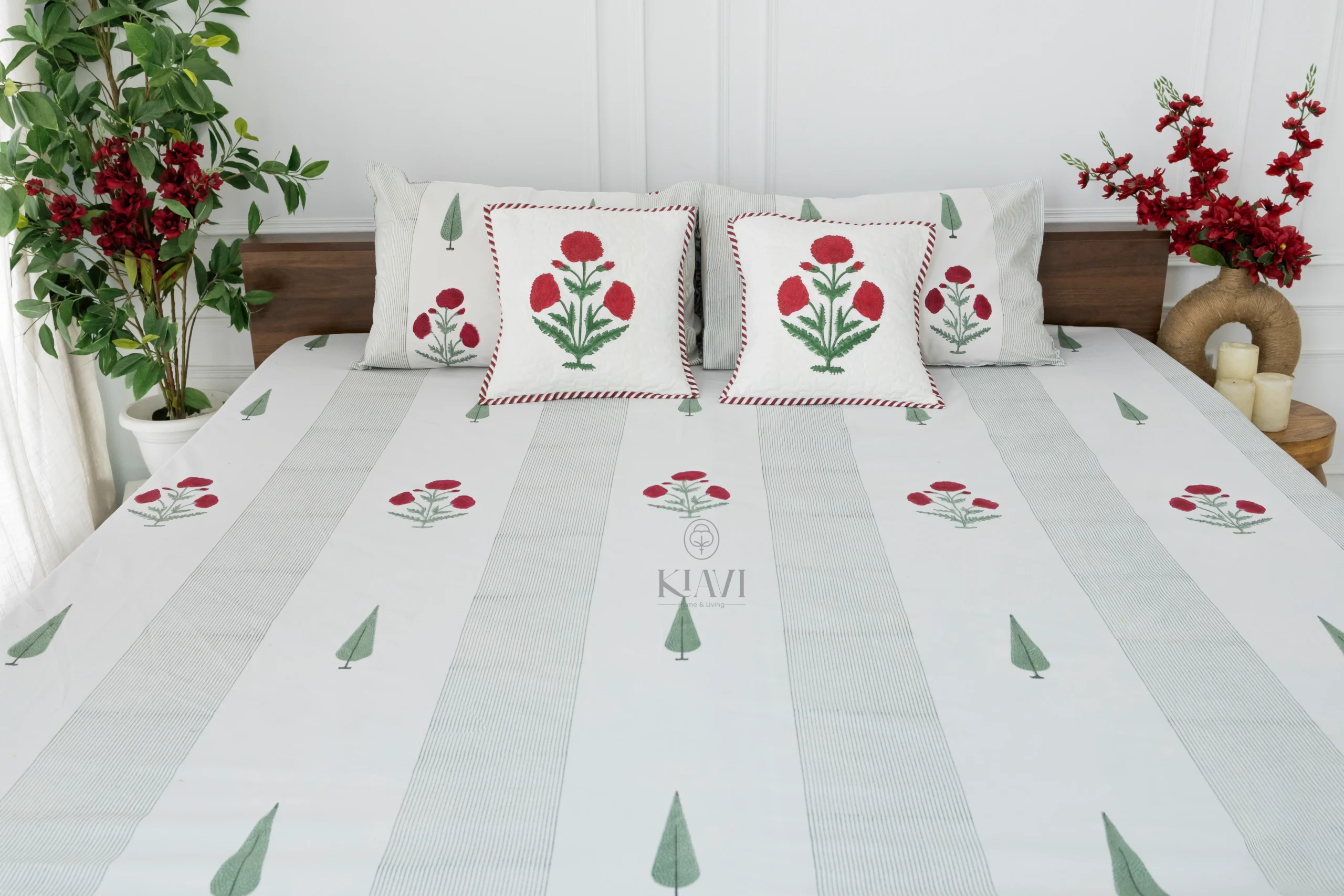 • Design: Elegant hand-block printed blue flowers, green leaves, and graceful trees arranged in a symmetrical, peaceful pattern that adds a sense of harmony to your room.