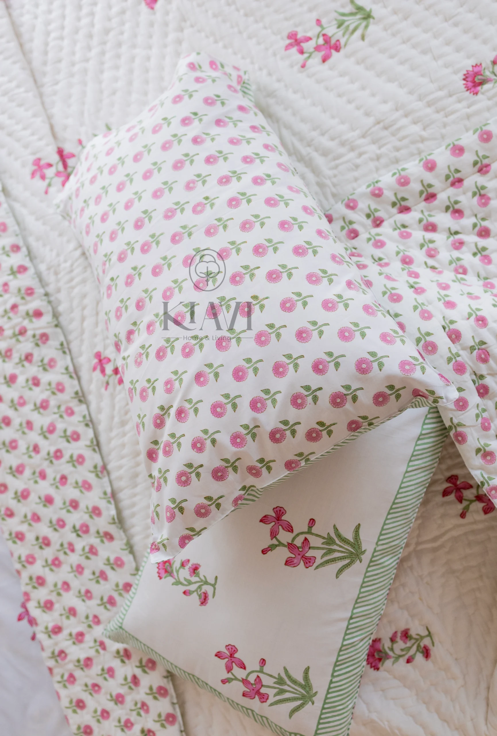 • Pillow Covers: 18*28 inches / 46*72 cms, matching the bedsheet with a hand-block printed floral design to enhance the overall look.