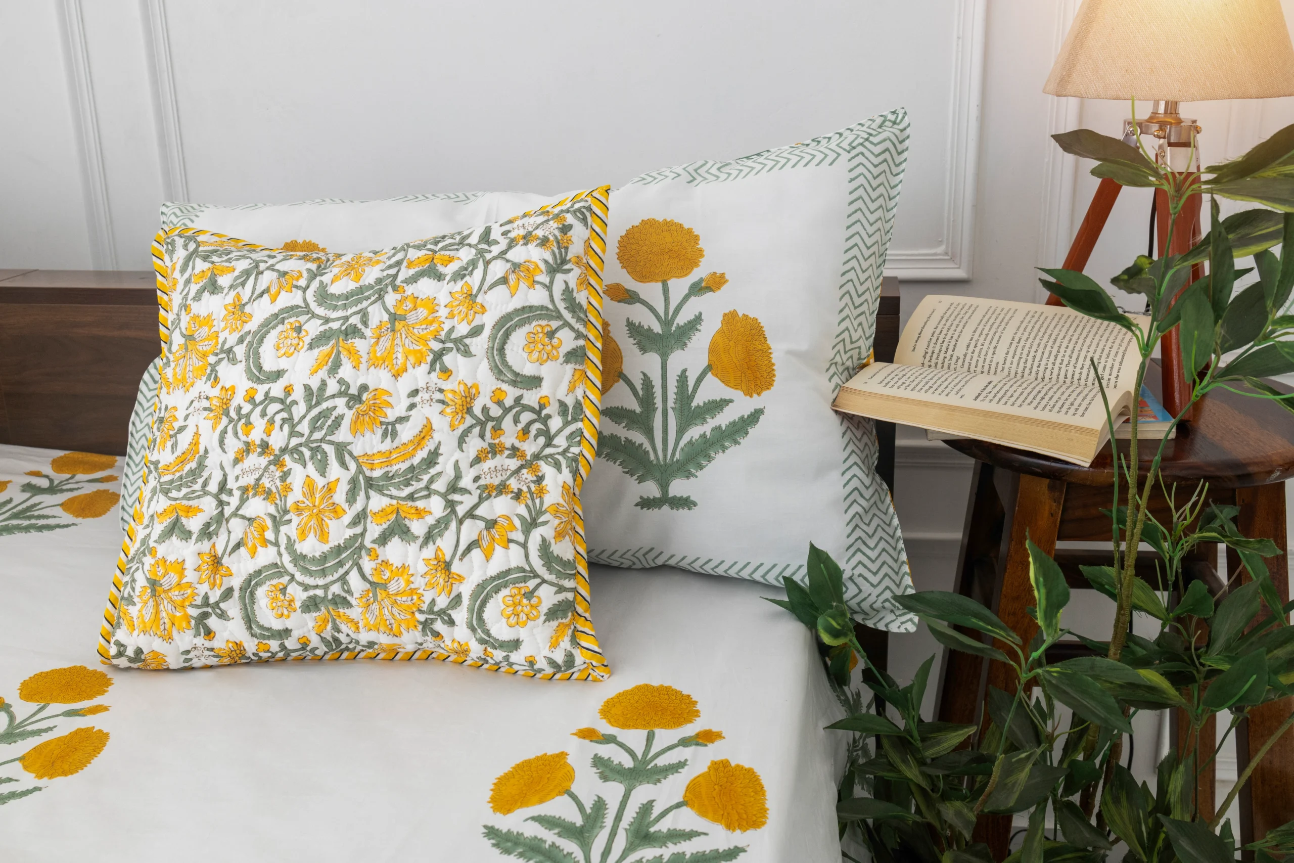 • Pillow Covers: 18*28 inches / 46*72 cms, matching the bedsheet with a hand-block printed floral design to enhance the overall look.